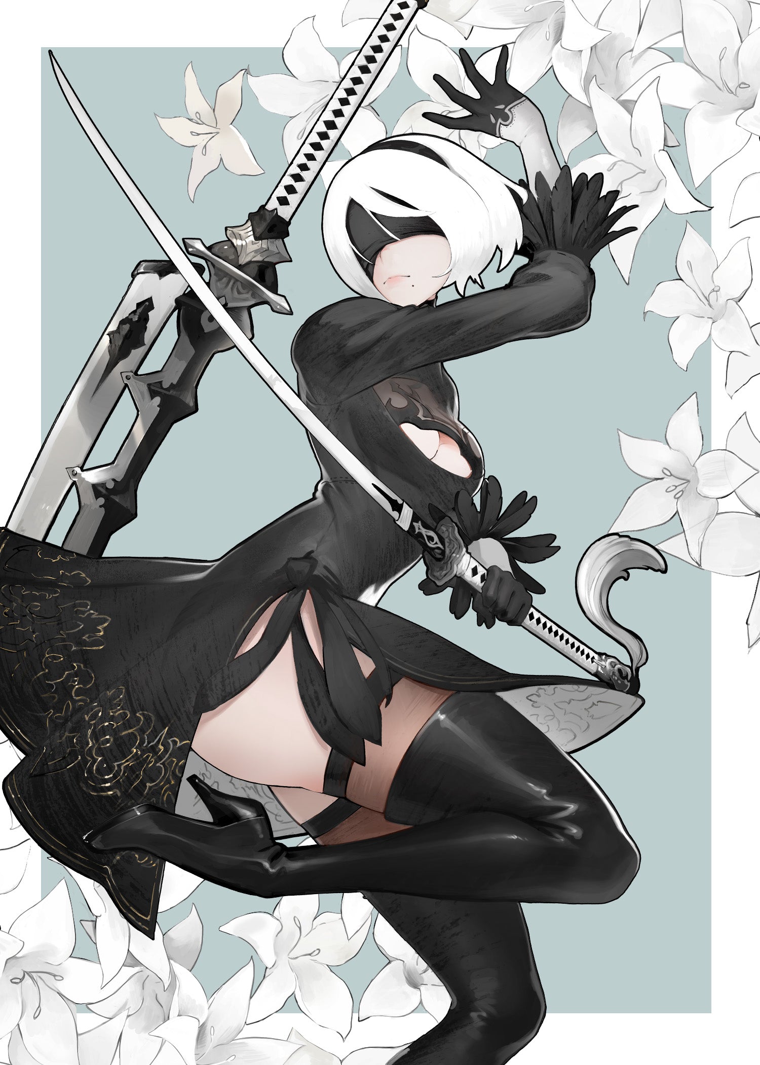 She wields her 2 iconic Swords with deadly elegance. The cold truth of her existence looming over a cruel memory of her closest friend and only loved one.